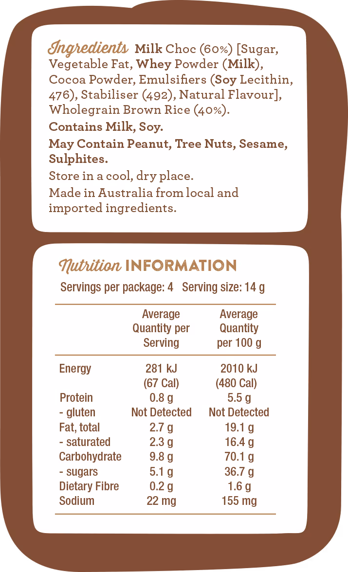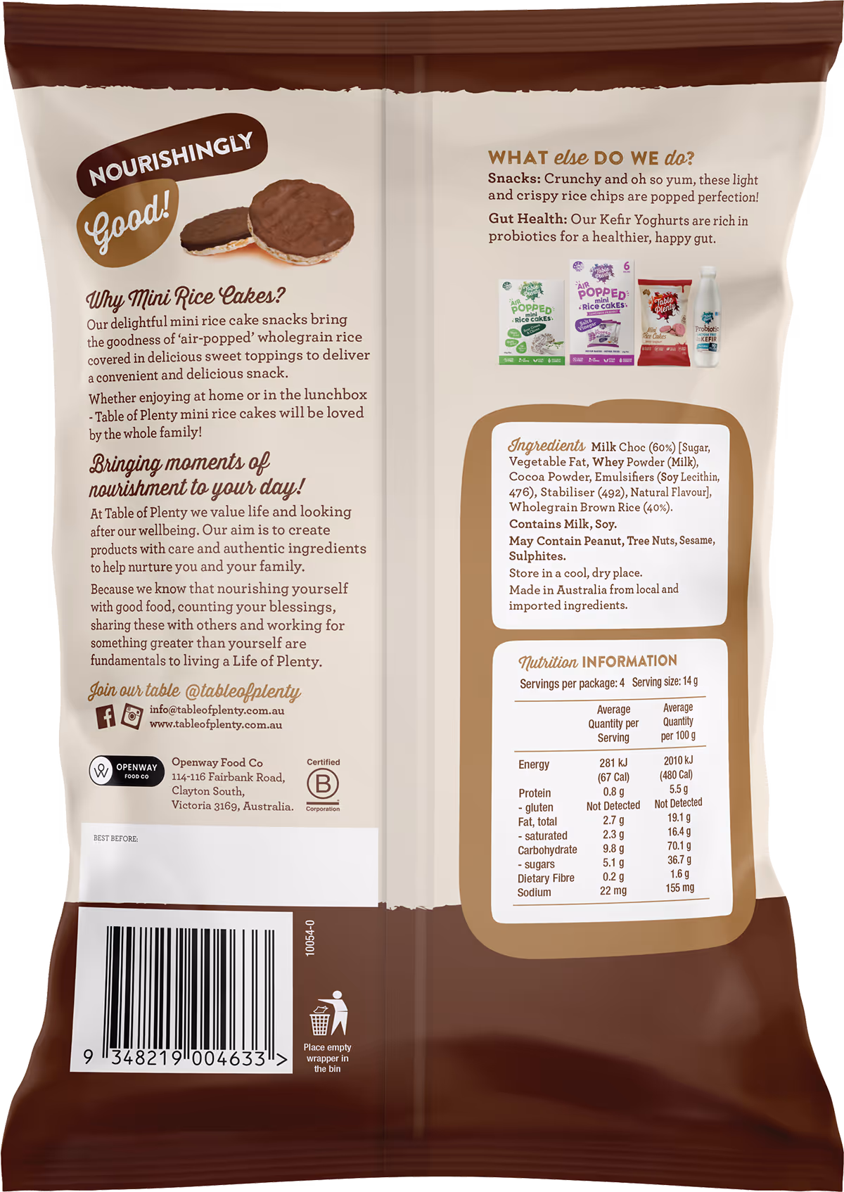 Light, crunchy and deliciously satisfying, our Milk Choc Topped Mini Rice Cakes are made from ‘air-popped’ wholegrain rice, creating a better-for-you snack the whole family will love.
