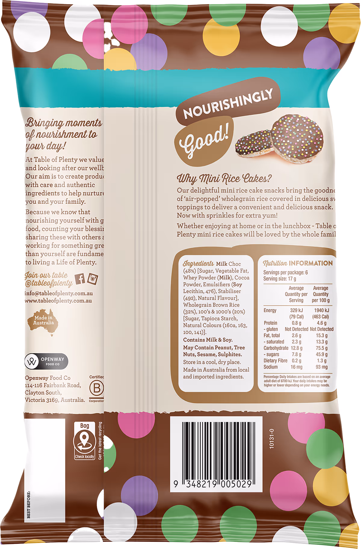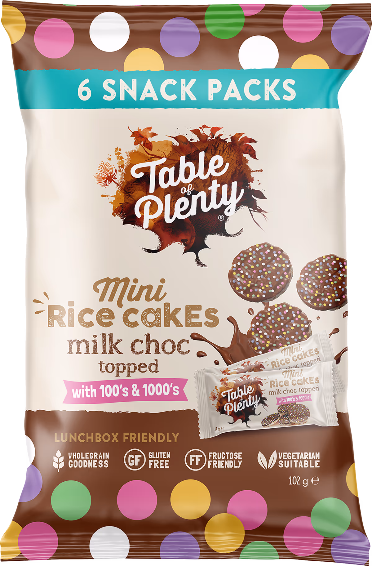 Light, crunchy and deliciously satisfying, our Milk Choc Topped Mini Rice Cakes are made from ‘air-popped’ wholegrain rice, creating a better-for-you snack the whole family will love.