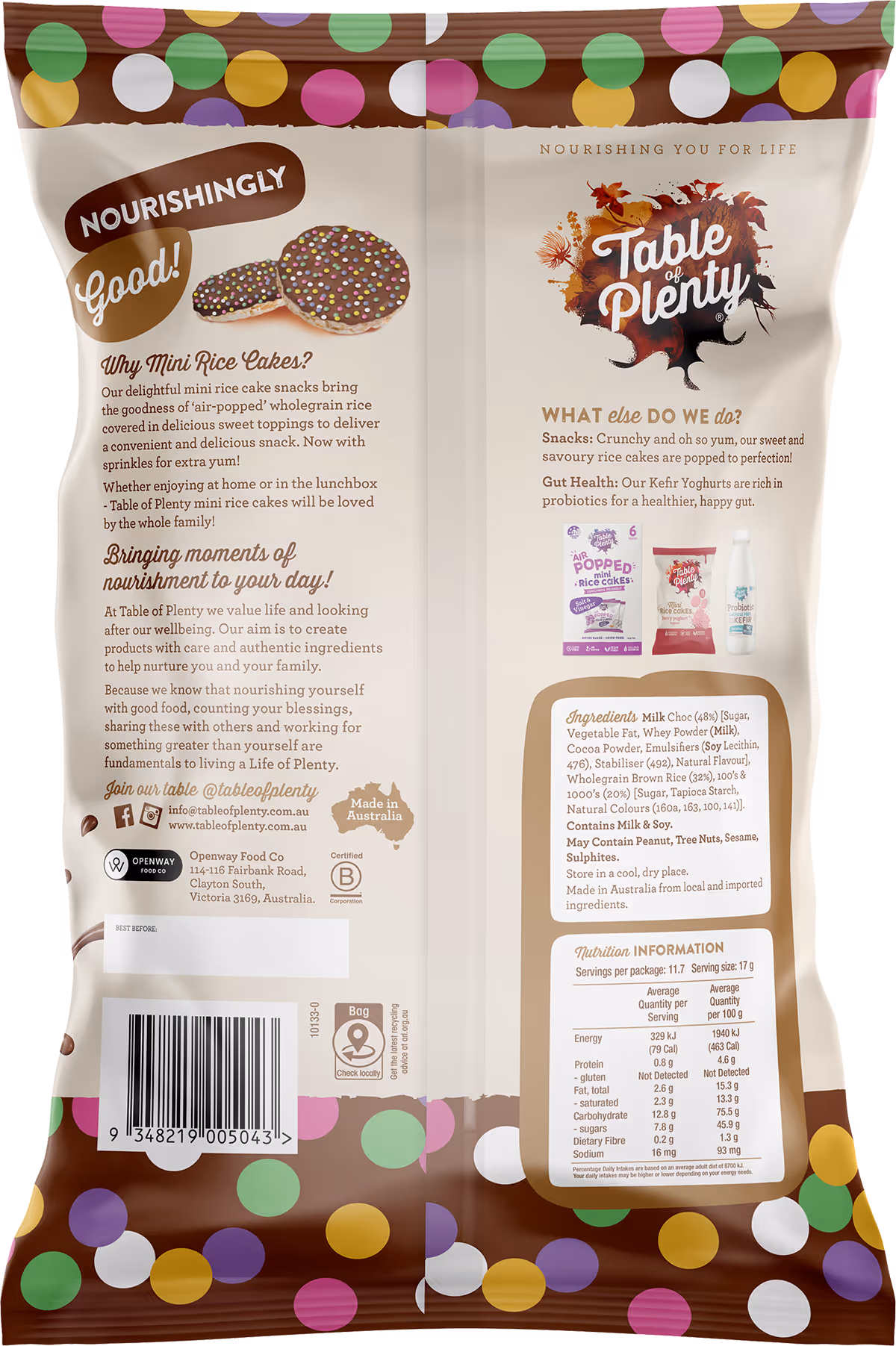 Light, crunchy and deliciously satisfying, our Milk Choc Topped Mini Rice Cakes are made from ‘air-popped’ wholegrain rice, creating a better-for-you snack the whole family will love.