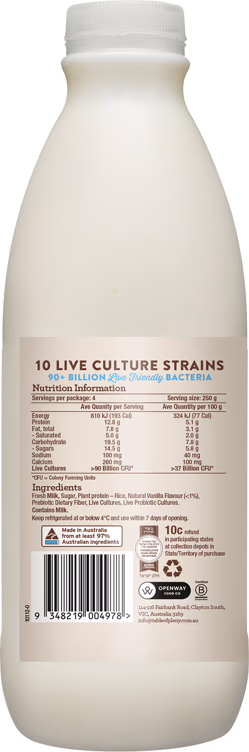 Smooth, tangy, and satisfying, our High Protein Probiotic Kefir delivers a protein boost alongside all the gut-health benefits of traditional kefir. Made with fresh milk from grass-fed Gippsland cows, it’s perfect for active lifestyles or anyone looking to stay fuller for longer.